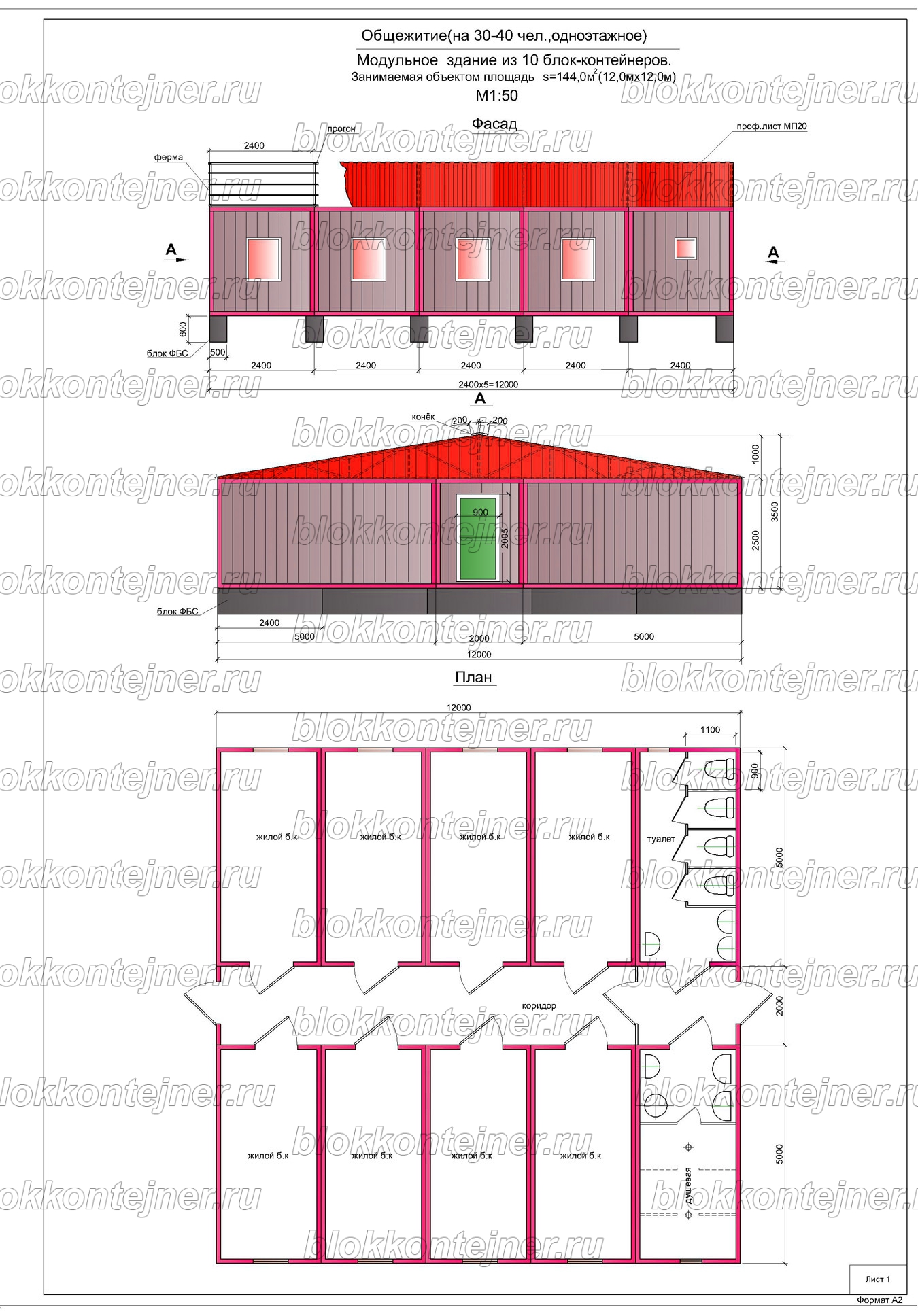 Одноэтажное общежитие на 30-40 человек, из 10-ти шт БК